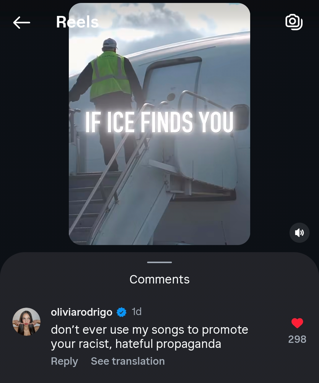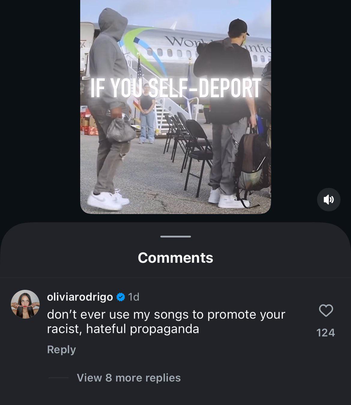Guest List Only ⭐️ Olivia Rodrigo criticizes the White House for using her song "All-American Bitch" in one of ICE's videos on Instagram.